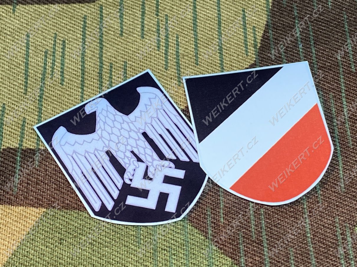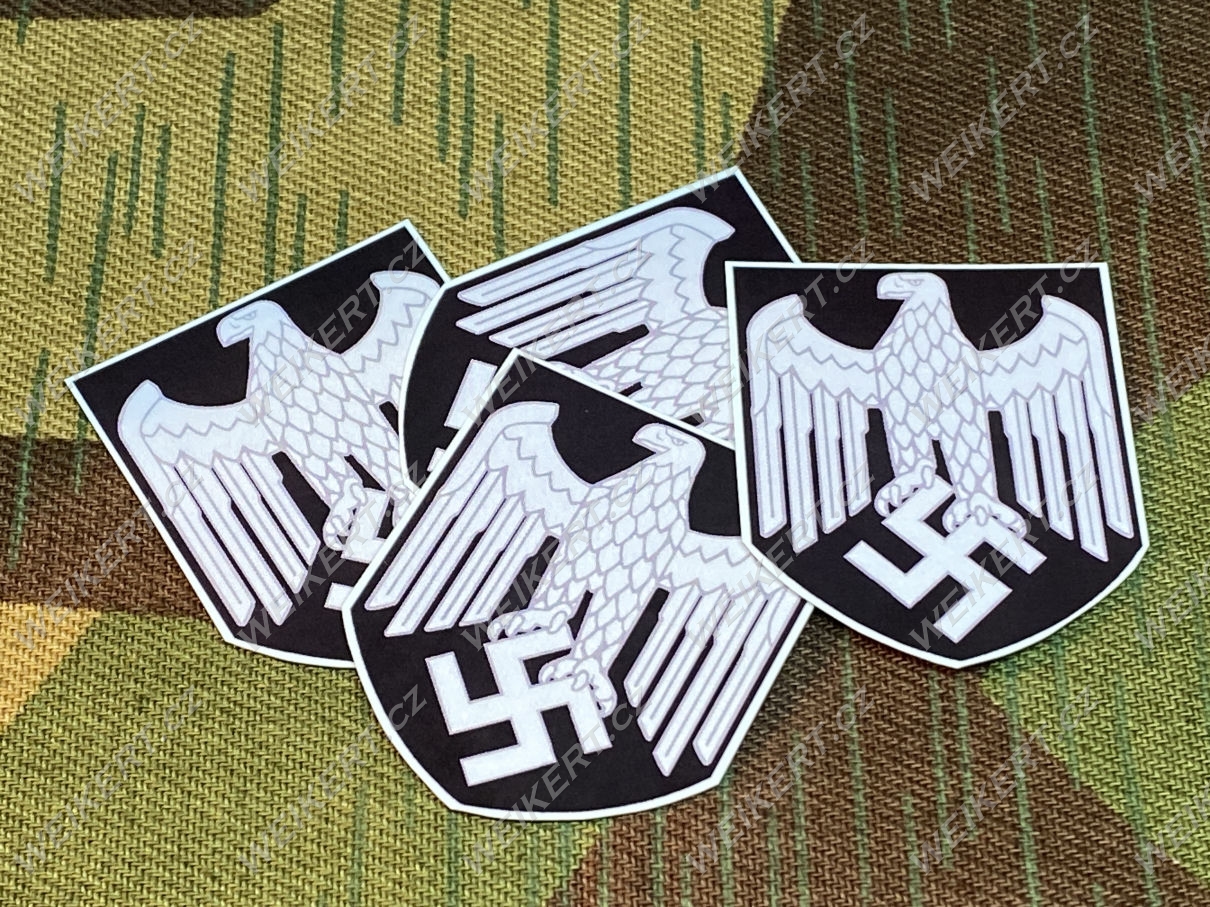 Das Wasserabziehbild zeigt die Abzeichen, die von deutschen Infanterieeinheiten der Wehrmacht (WH/HEER) an den Seiten ihrer Helme angebracht wurden. Dies ist Version 4 mit dem Adler-Design aus der Spätphase des Krieges (mit dunklerer Umrandung) in einem helleren Farbton auf schwarzem Schild.