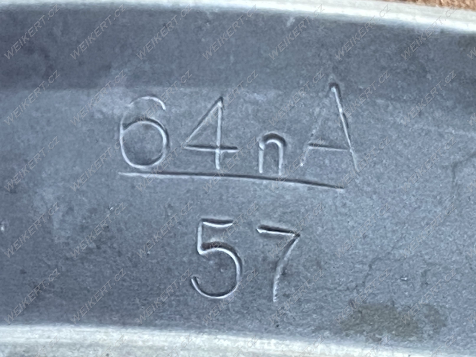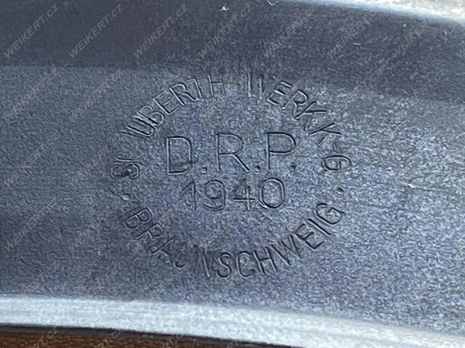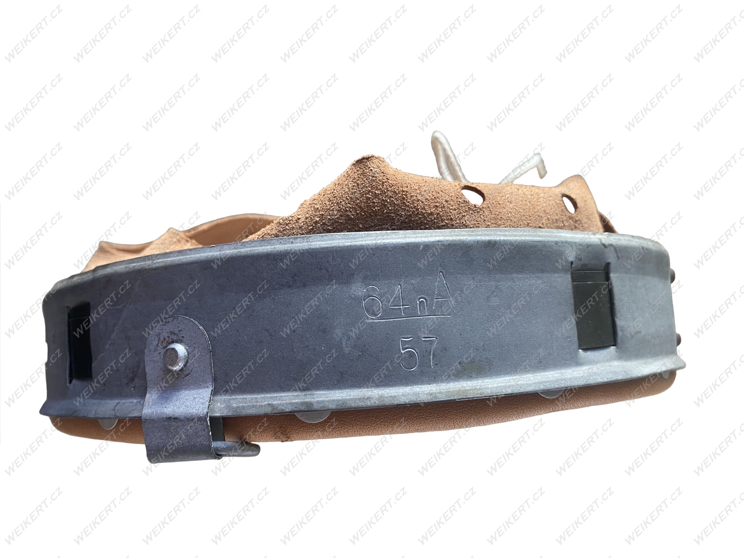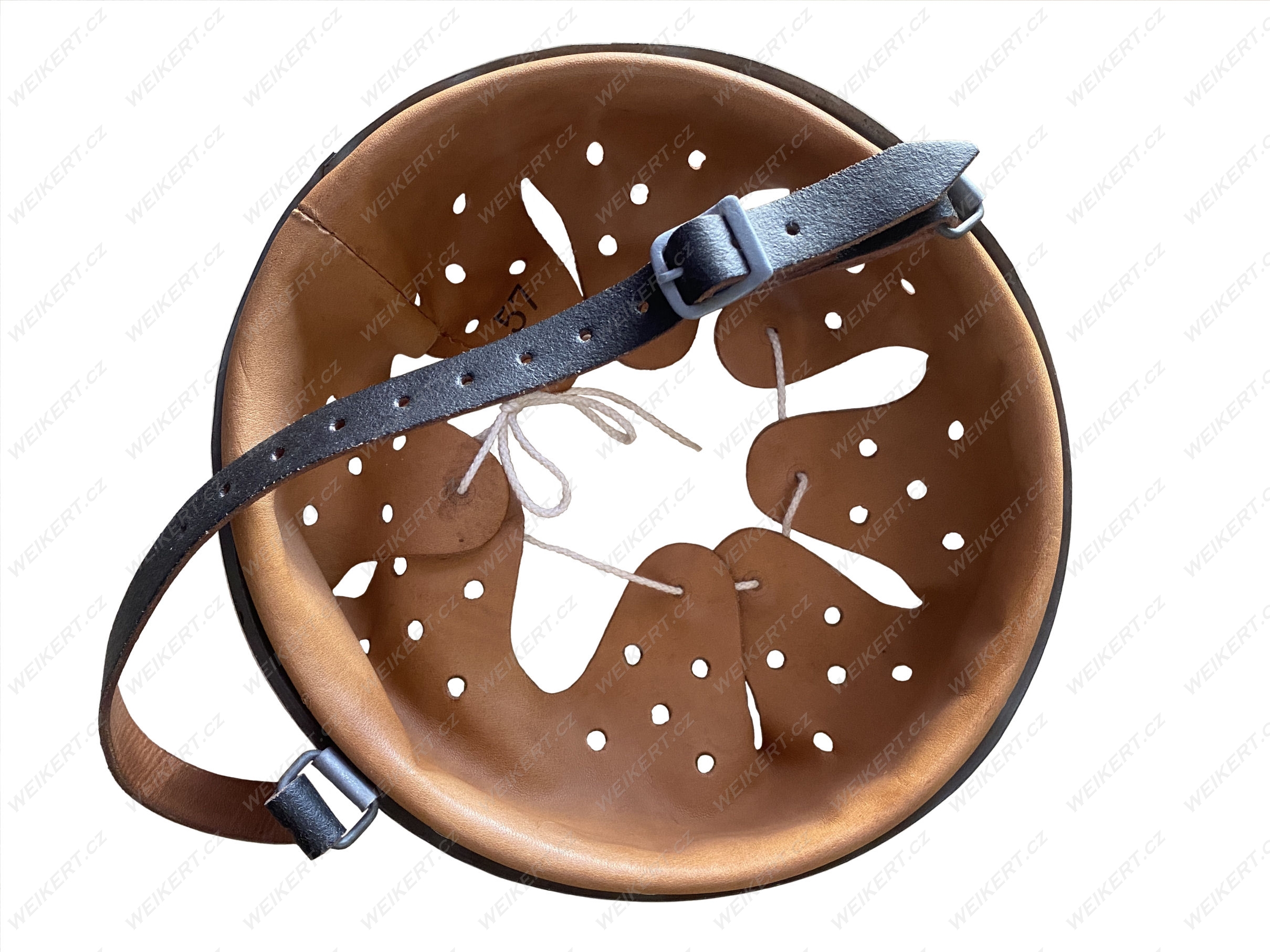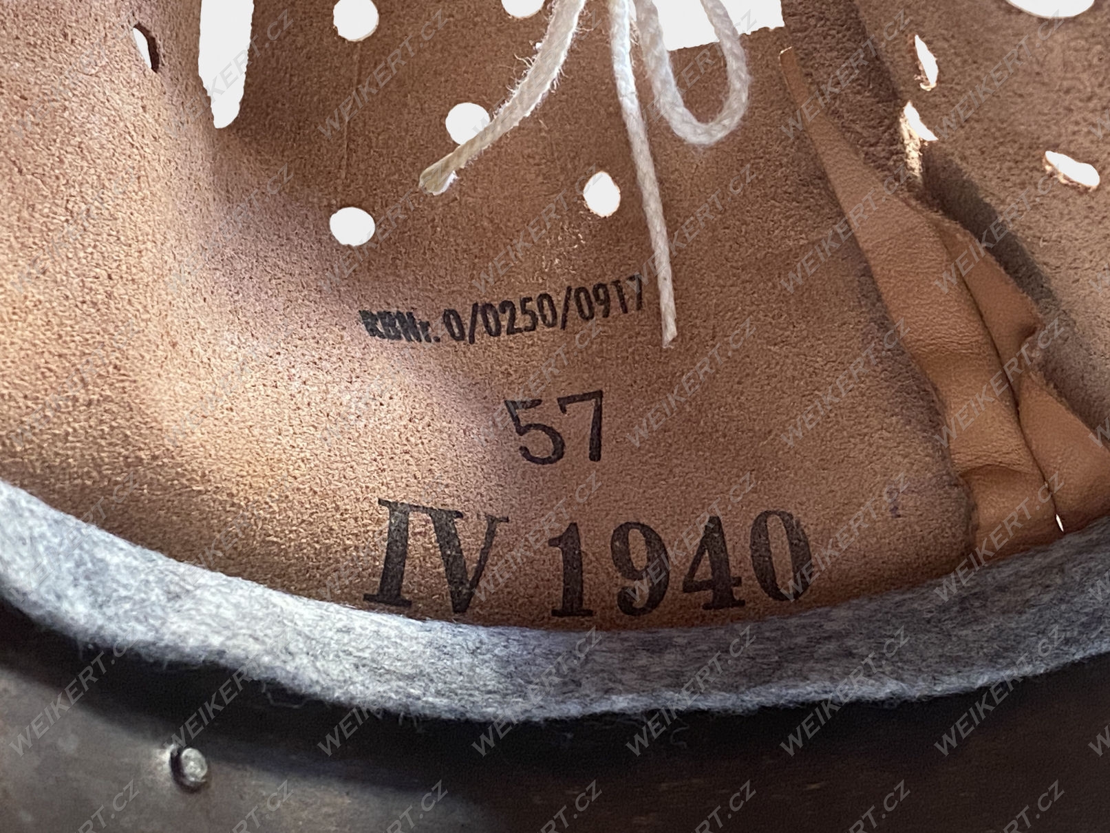 The metal rim is stamped with markings. The leather lining is stamped with the size and markings. The markings are also stamped on the leather chinstrap. The details are clearly visible in the actual photos.