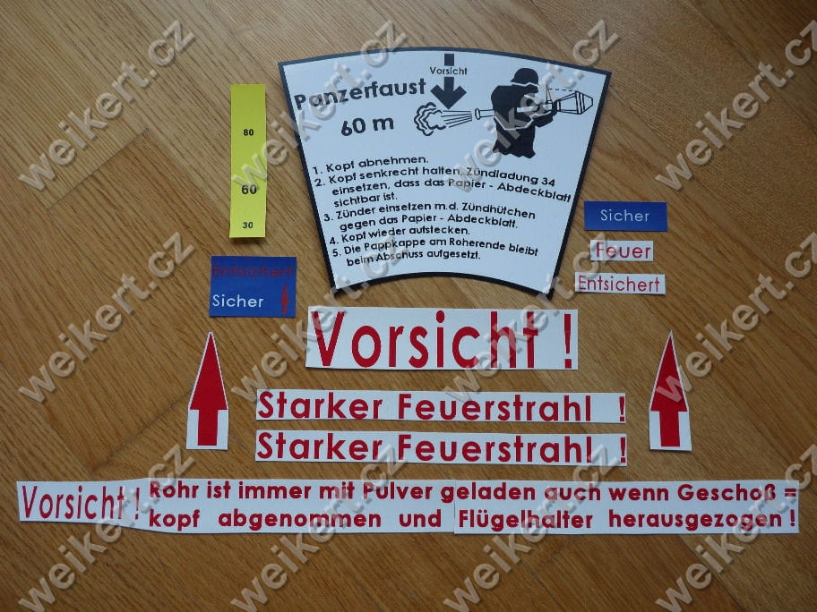 The set includes decals with instructions for use on the head Panzerfaust and warning labels on the tube.