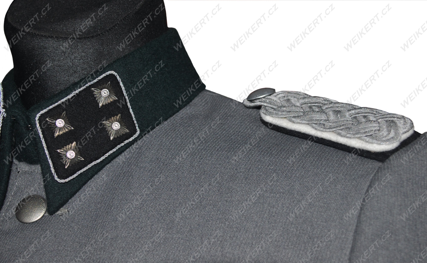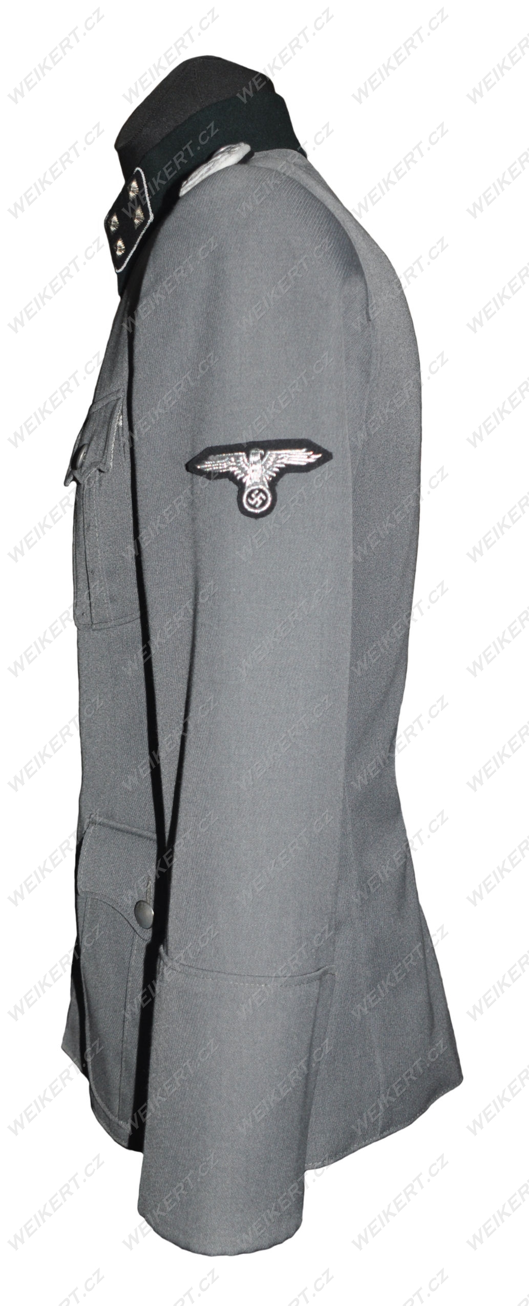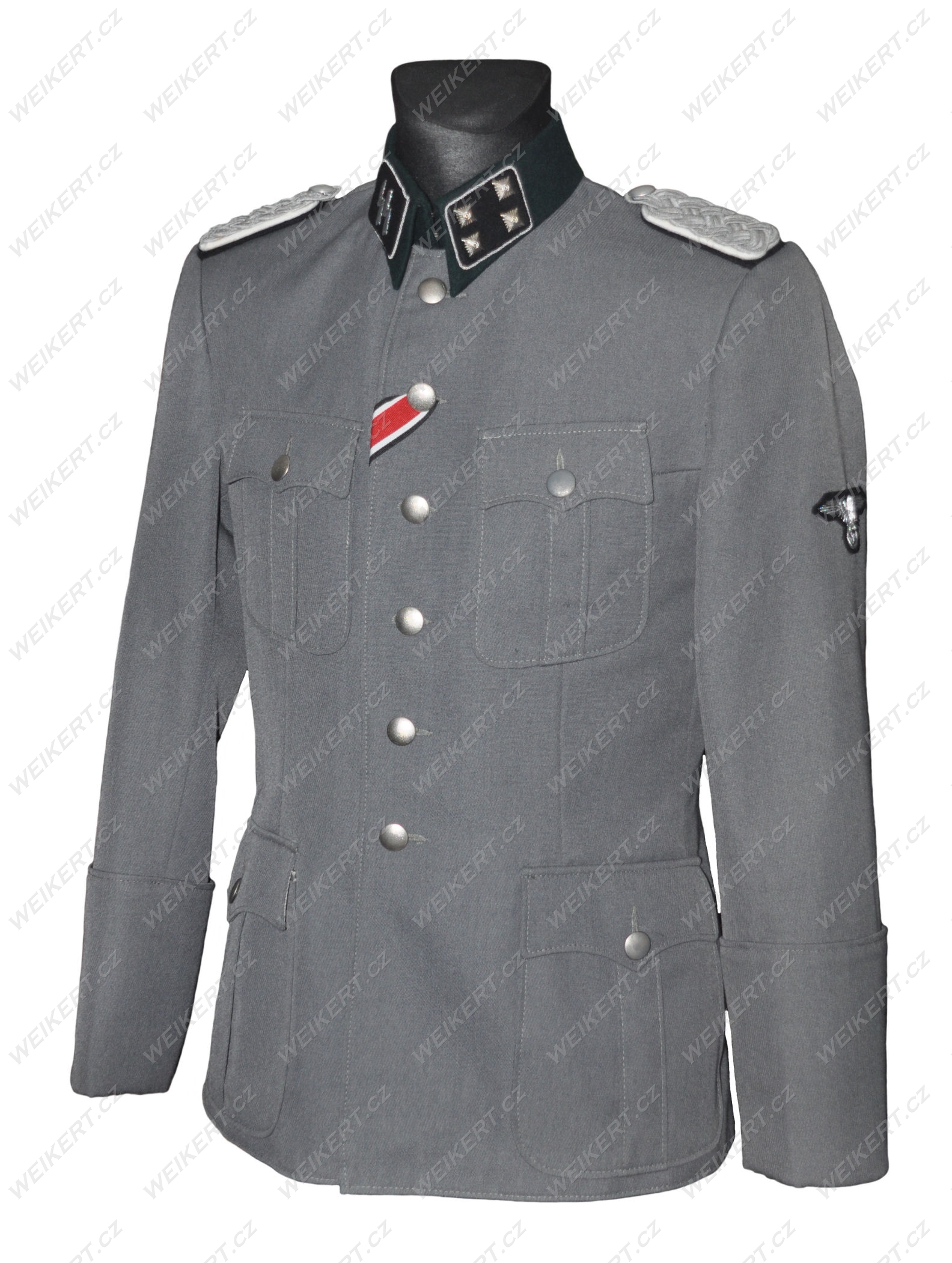 A perfect replica of a German officer's uniform jacket used by Waffen SS units during World War II. Featuring a special steel-tone gabardine, typically worn by staff officers in custom-made uniforms. The jacket features hand-embroidered bullion collar tabs and an eagle on the sleeve, pea-dot buttons, and an Iron Cross ribbon.