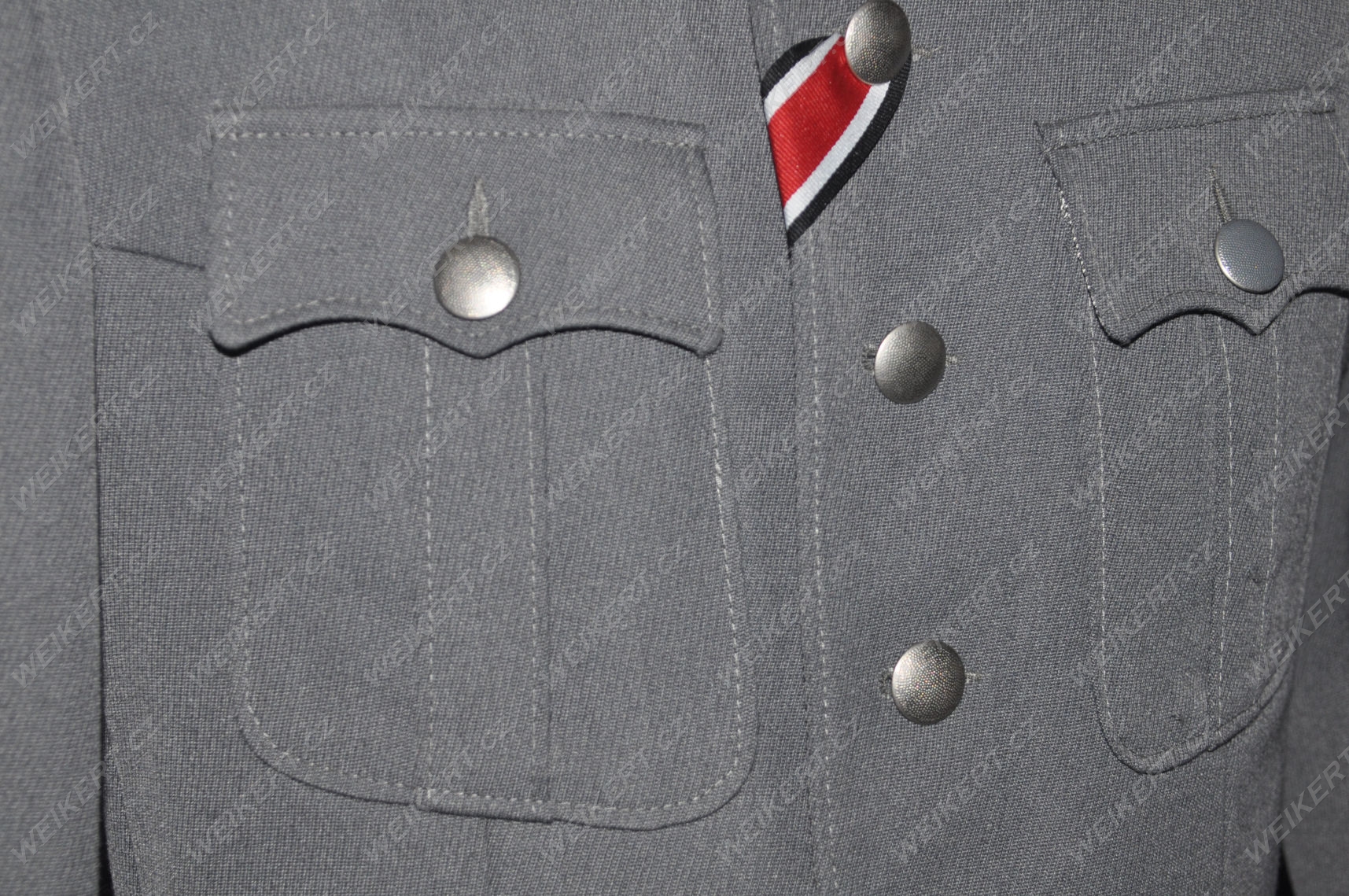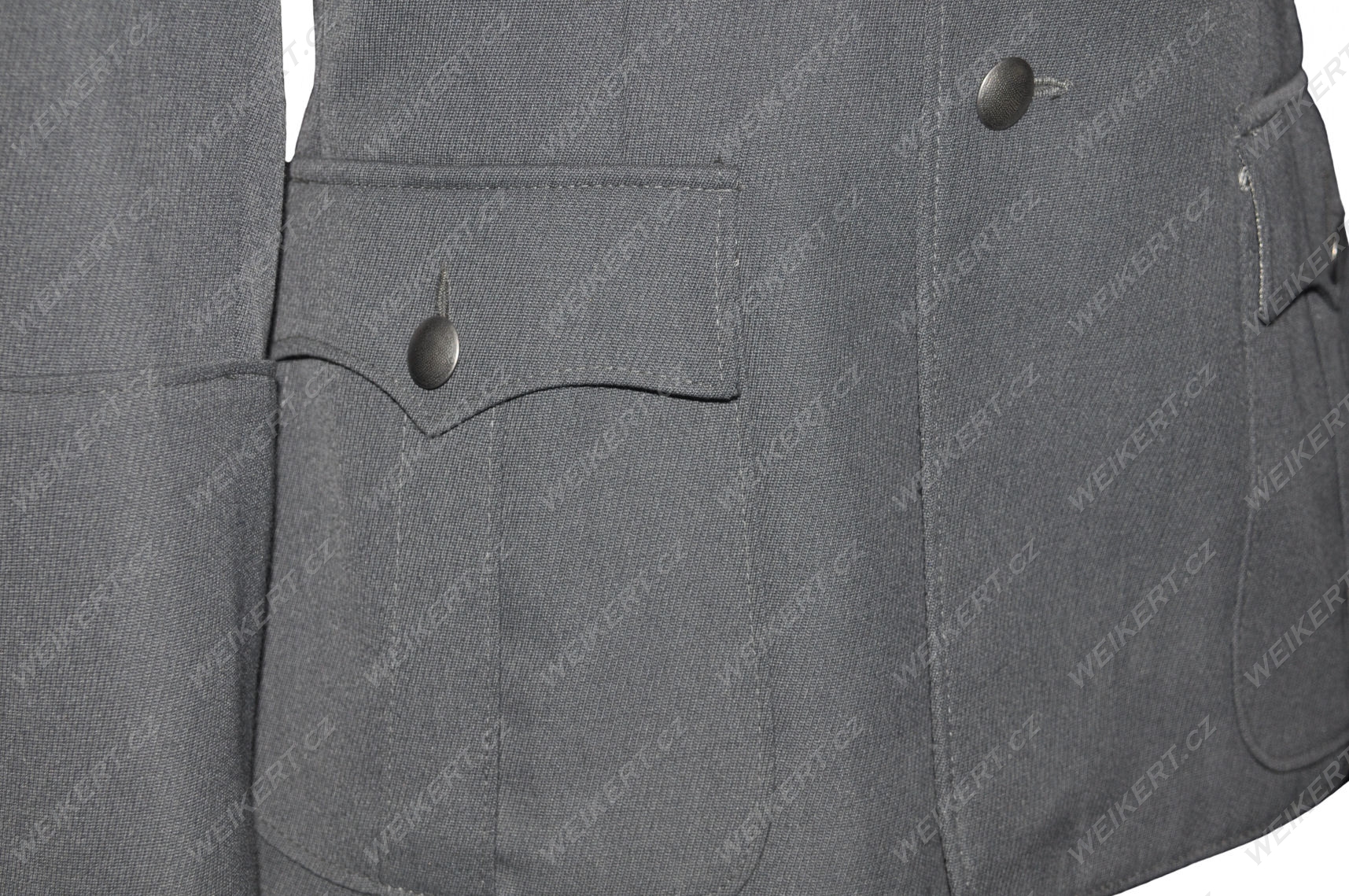 Product used on a film set. The material is specially patinated and aged. A unique steel-tone gabardine. Uniforms in this shade are currently unavailable. The uniform may show traces of dirt and spots, adding to the realistic effect and reflecting light wear from normal use. However, as can be seen in the original photos, it is in excellent condition with only minor signs of wear (e.g., marks from the installation of insignia on the pockets).