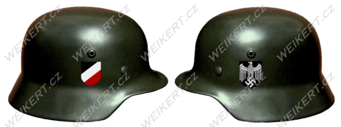 Water decals shows insignia placed on the both sides of the helmet used by German infantry units of the Wehrmacht (WH / HEER). This is version 3, features the most common eagle design used during World War II (the so-called "big foot") in a lighter shade on a black shield.