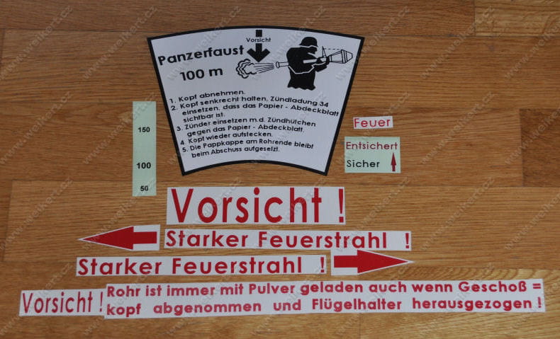 W skład kompletu wchodzą kalkomanie z instrukcją użycia na głowicę panzerfausta oraz napisy ostrzegawcze na rurę.