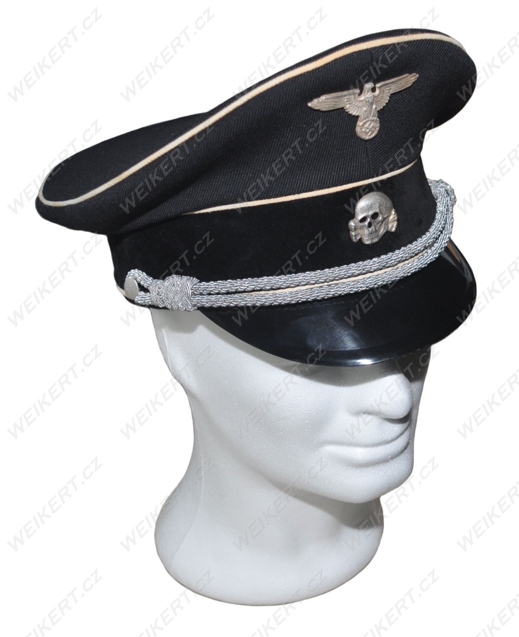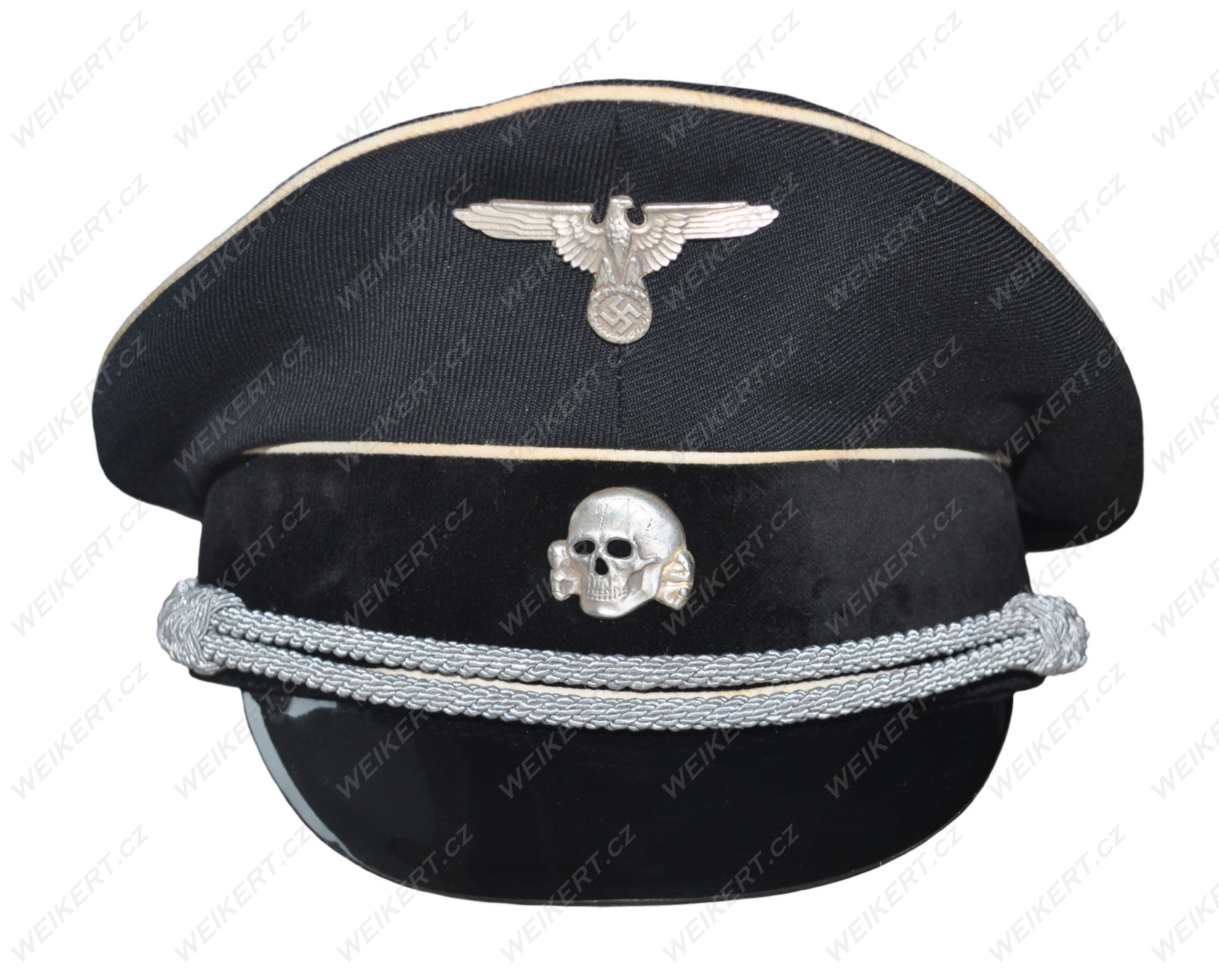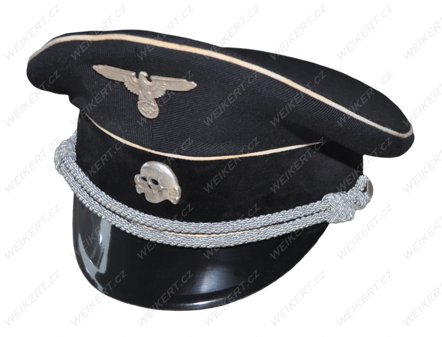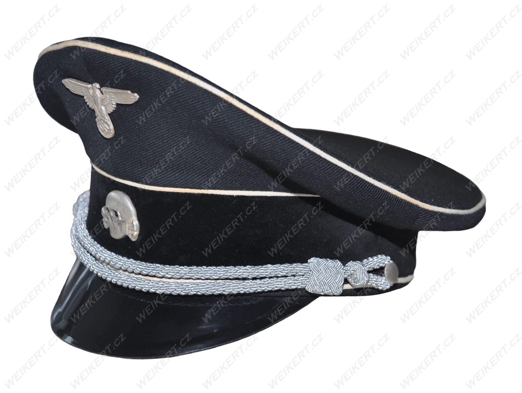Doskonała replika niemieckiej postarzanej czapki oficerskiej ( czarna - Allgemeine SS ) - używanej w czasie II Wojny Światowej.