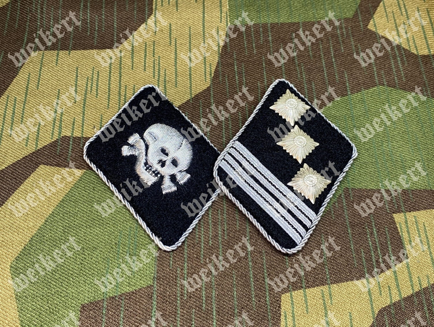 Ta wersja przedstawia jedną patkę z czaszką zwróconą do środka i drugą przedstawiającą oficerski stopień.
