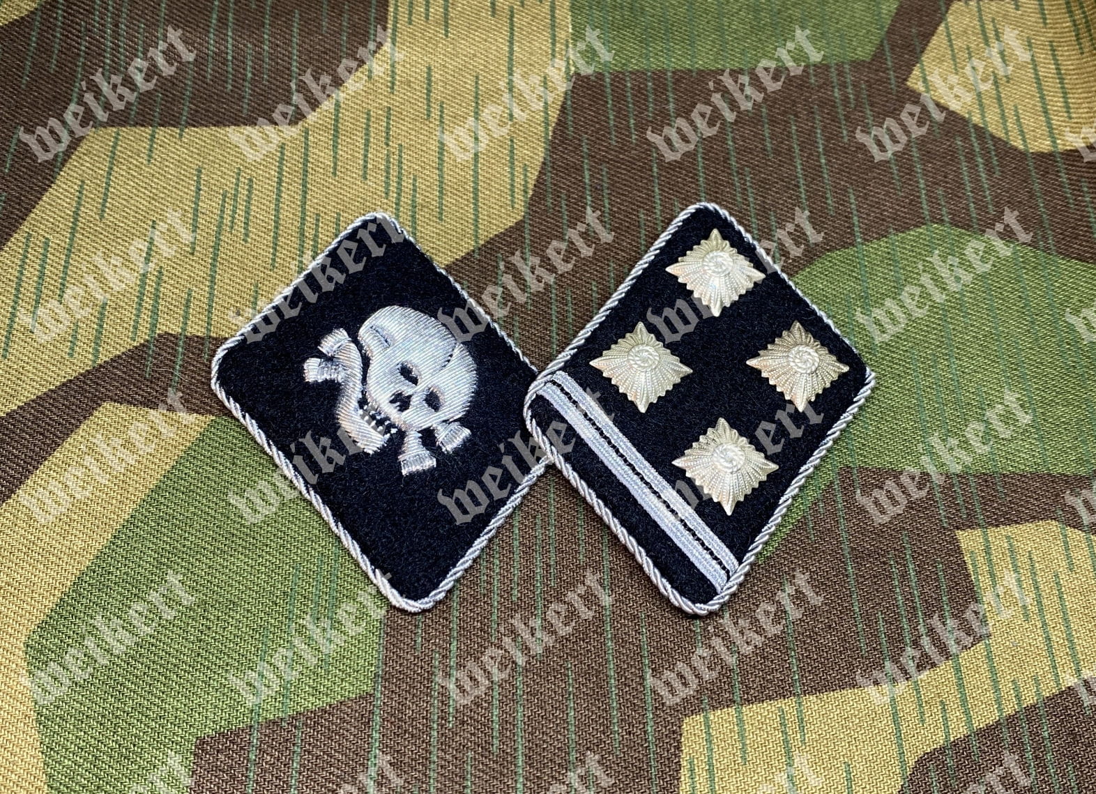 Ta wersja przedstawia jedną patkę z czaszką zwróconą do środka i drugą przedstawiającą oficerski stopień.