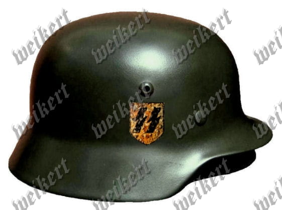 Kalkomania wodna przedstawiająca postarzaną tarczę z runami SS z wczesnego okresu umieszczaną po bokach hełmu .
