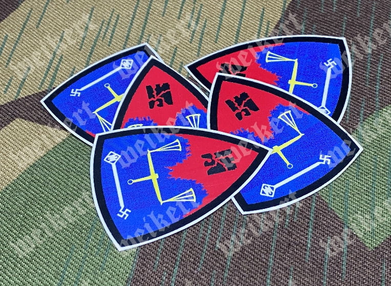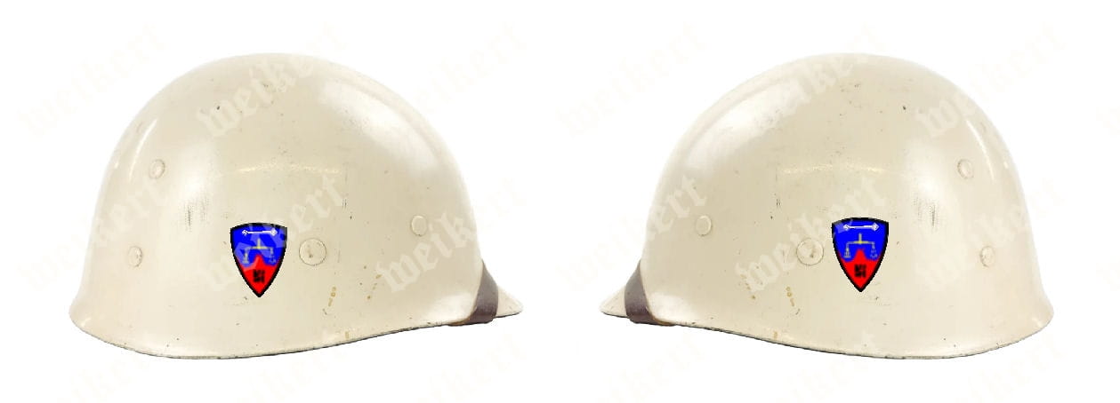 Водные декали с изображением знаков различия, размещенных на обеих сторонах белого подшлемника шлема М1, используемого подразделениями АРМИИ США — 6850-го отряда внутренней безопасности Нюрнберга — версия 1.